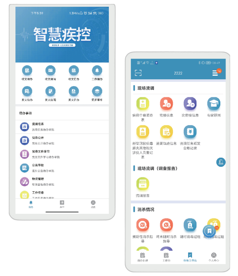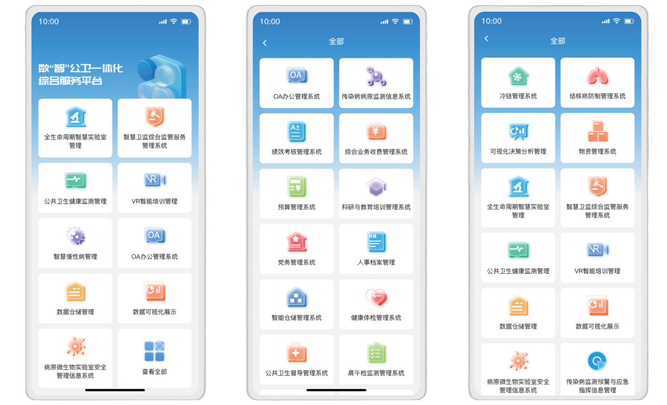 系统支持通过手机、平板终端设备安装APP(Android),实现待处理工作、已办事宜、消息提醒等功能,涵盖了OA办公管理、绩效考核管理、预算管理、人事档案管理、科研与教育培训管理、党务管理、晨午检监测管理、冷链管理、全生命周期智慧实验室管理、物资管理、智慧卫监综合监管服务管理、公共卫生督导管理、智慧仓储管理、传染病监测预警与应急指挥信息系统等子系统。